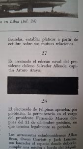 En la página 1826 del tomo cinco de la edición de 1974, de la que era dueña doña María, la vecina del frente, el artículo de la historia de Chile terminaba abruptamente así: “En las [elecciones] de 1970 venció el socialista Salvador Allende, quien en noviembre tomó posesión de la presidencia de la República”.