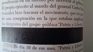 En el artículo sobre Chile del Libro del año Barsa, que comienza en la página 105, múltiples ocultaciones eclipsan los detalles de los acontecimientos del día del golpe, palabra que es concienzudamente cambiada por “pronunciamiento militar”, a veces con una especie de timbre y otras a mano. Esa misma mano reemplaza el adjetivo que originalmente calificaba a la milicia de ultraderecha Patria y Libertad para describirla simplemente como un grupo “político”.