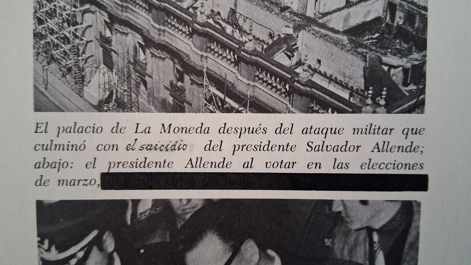 Se suprime el nombre de Patria y Libertad de la lectura de una foto que destaca los ataques terroristas a las torres de alta tensión, como también está ausente de la descripción del asesinato del edecán naval. El resumen de los hechos del 11 de septiembre está corregido para eliminar texto indeseable y reemplazarlo, a mano, con las palabras “pronunciamiento militar”. La lectura que acompañaba la foto de La Moneda en llamas fue reemplazada por “(sept. 11)”, obra de una mano con una caligrafía cursiva bastante aceptable.